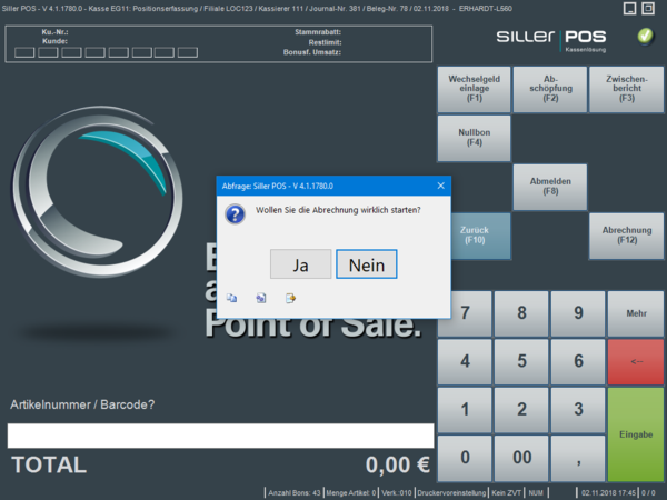 Die Kassiererabrechnung wird gestartet durch Bestätigung der Abfrage mit "Ja".