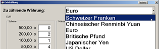 Durch Wechseln der Währung im Klappmenü werden automatisch die Werte der aktuellen Währung zwischengespeichert. Es kann nun auch für andere (im System angelegte Fremdwährungen) eine Geldzählung durchgeführt werden.