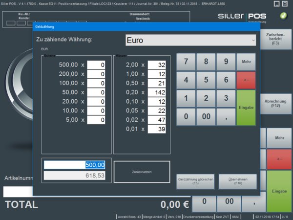 Nachdem für alle verwendeten Währungen die Zählung durchgeführt und die entsprechenden Werte erfasst wurden, wird die Abrechnung über den Button "Übernehmen (F10)" beendet.