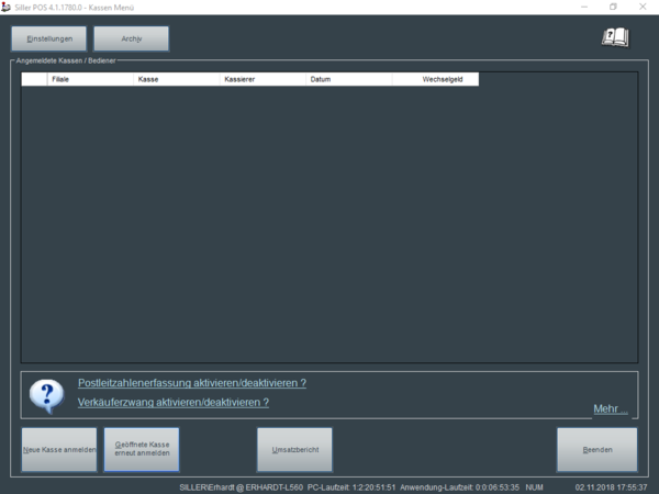Druckerzuordnung). Die Kasse wechselt anschließend in das Kassenmenü.