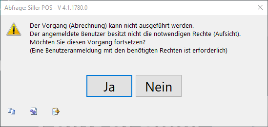 Die Kassiererabrechnung kann optional auch an eine Berechtigungsstufe gebunden werden (siehe "Rechteverwaltung"). Es erscheint dann im Abrechnungsprozess eine entsprechende Abfrage.