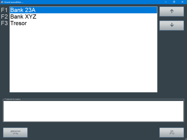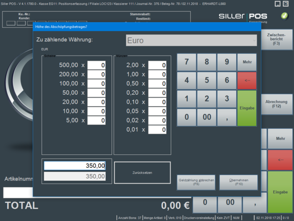 Es ist möglich, diesen Betrag über die Stückelungsmaske, als Gesamtsumme oder als Mischung aus beidem zu erfassen. Es erfolgt anschließend der Druck eines Abschöpfungsbeleges.