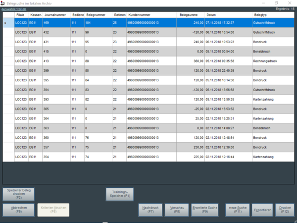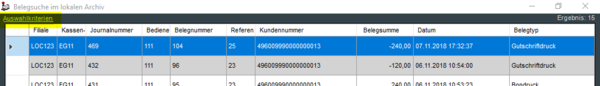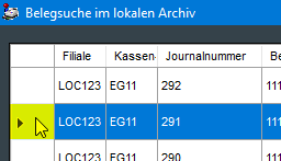 Die Belegdatenbank bzw. das Belegarchiv kann über den Button "Archiv" im Kassenmenü aufgerufen werden. Der Zugang zur Belegdatenbank kann an eine Berechtigungsgruppe gebunden werden (Standard nach Installation: Aufsicht, siehe auch "Rechteverwaltung").