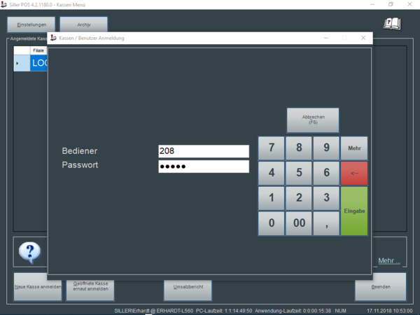 Bediener (Kassierer bei Anmeldung der Kasse)