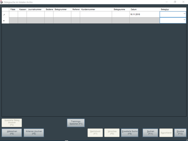 Nach Bestätigung der Bedieneranmeldung mit "Eingabe" oder Taste "ENTER" wird die "Belegsuche im lokalen Archiv" geöffnet. Hier stehen direkt folgende Filterkriterien zur Verfügung: