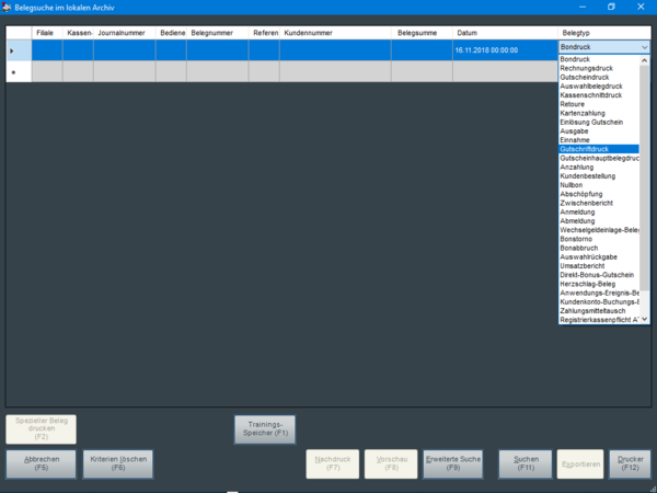 Zusätzlich soll jetzt noch der Belegtyp auf "Gutschriftdruck" eingegrenzt werden. Man möchte also alle Belege mit einer ausgestellten Warengutschrift sehen, die am 16.11.2018 erzeugt wurden.