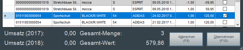 Die markierten Positionen (Häkchen) werden mit dem Button "Übernehmen (F10)" als Retoure-Positionen in den Kassenbeleg übernommen. Die Menge und der VK-Wert entspricht dabei dem ursprünglichen Artikelwert, zudem der Artikel im ursprünglichen Beleg verkauft wurde.