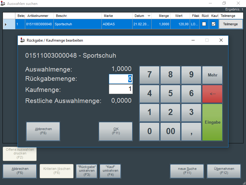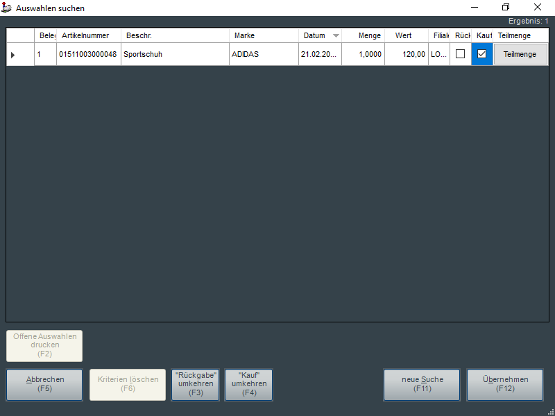 Durch Markieren der einzelnen Positionen in den Spalten Rückgabe oder Kauf wird nun die gewünschte Auswahlposition entweder als Rückgabe oder als Kauf gekennzeichnet und durch abschließendes Drücken des Buttons "Übernehmen (F12)" in den Verkaufsbeleg übernommen.
