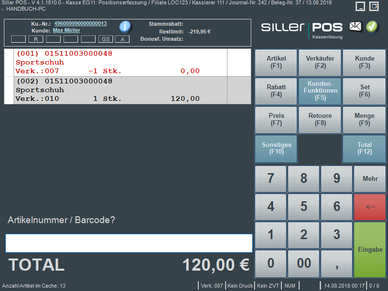 Der Auswahlbarcode kann auch ohne vorheriges Auslösen der Funktion "Auswahl-Rückgabe (F5)" direkt in der Erfasszeile gescannt werden, während diese in der Positionserfassung in der Abfrage „Artikelnummer / Barcode?“ steht. Siller POS erkennt automatisch, dass es sich um eine Auswahlrückgabe handelt und ruft automatisch die Funktion auf, ordnet den Kunden des Auswahlbeleges zu und zeigt die Positionen zur Weiterbearbeitung der Auswahl auf dem Bildschirm an.