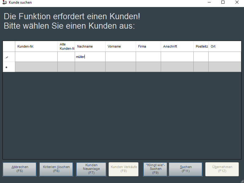 Hier wird nun gewünschte Kunde über die Filterfunktionen gesucht und über den Button "Übernehmen (F12)" in den Beleg übernommen. In der nun erscheinenden Abfrage wird der Belegbarcode des Ursprungsbelegs gefordert, also der des umzubuchenden Belegs.