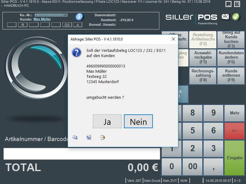 Die Nachbuchung kann optional auch an ein höheres Benutzerrecht gebunden sein oder vollständig unterbunden werden ("Nachbuchung Verkaufsbeleg auf Kundenkonto"). Dies wird über die Einstellungen (Rechteverwaltung) definiert.