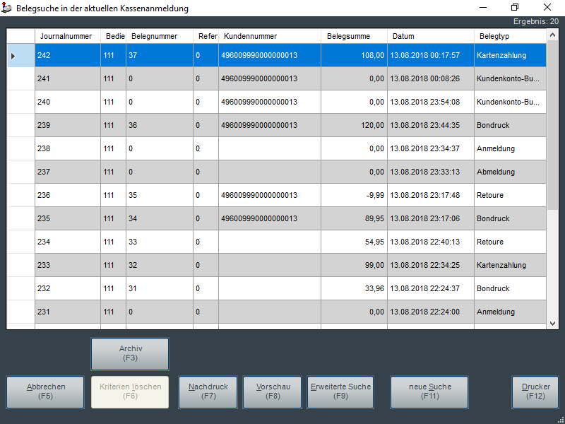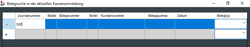 Suchkriterien können sein: Journalnummer, Bediener, Belegnummer, Referenz, Kundennummer, Belegsumme, Datum oder Belegtyp. Im Filter ist eine Wildcard-Suche mit * möglich, beispielsweise kann damit eine Suche nach Kundennummer *43329 (Ergebnis: die Belege aller Kunden, deren Kundennummern auf 43329 enden).