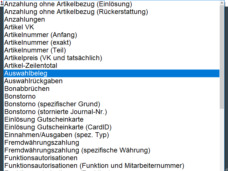Jeder Beleg erhält automatisch durch die Anwendung aufgrund seines Inhalts eine Zuordnung zu einem Belegtyp. Nach diesem Belegtyp kann hier gefiltert werden. Wird beispielsweise eine Kassiererabrechnung (= Kassenabschluss / Kassenschnitt) gesucht, so ist dieser unter dem Belegtyp Kassenschnittdruck zu finden (siehe hierzu auch Belegnummerierung).