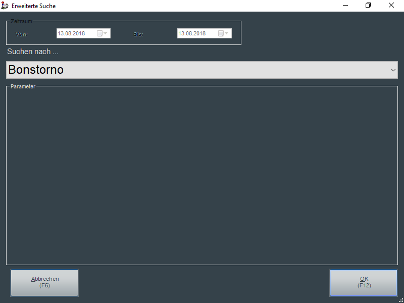 Die Funktion "Erweiterte Suche (F9)" ermöglicht eine spezifische Suche nach bestimmten Beleginhalten auf Basis vordefinierter Such- und Filterkriterien. Wurde bereits eine Vorselektion in der Belegsuche getroffen, setzt die erweiterte Suche auf diesem Suchergebnis auf, auch nachfolgende erweiterte Suchen setzen immer auf dem zuvor bereits gefilterten Ergebnis auf. Für einzelne Suchen kann die Erfassung von Suchparametern erforderlich sein (die Erfassung ist key sensitive), wie beispielsweise ein Grund für Bonstorno.