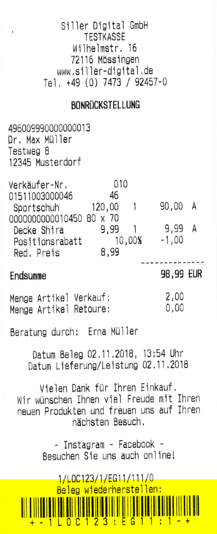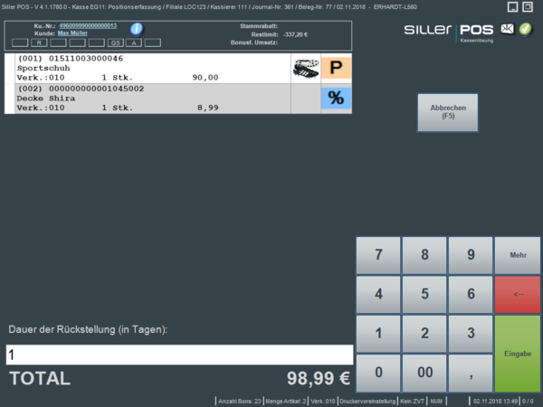 Es ist dennoch möglich, für jeden zu parkenden Beleg eine individuelle Rückstellungsdauer je Vorgang zu erfassen. Im Beispiel wird der Beleg automatisch gelöscht, wenn dieser bis zur Abrechnung des nächsten Tages nicht wiederhergestellt und weiterbearbeitet wurde (1 Tag ab heutigem Datum). Im Anschluss wird der Beleg als geparkter Beleg gespeichert und auf dem definierten Drucker ausgegeben. Der Beleg kann über den Belegbarcode wieder zur Weiterbearbeitung aufgerufen werden. Alternativ ist dieser auch über den Button "Bon reaktivieren (F12)" abrufbar (eine Liste der geparkten Belege lässt sich mit Taste ENTER oder "Eingabe" öffnen).