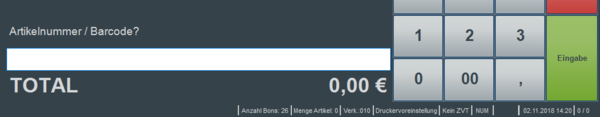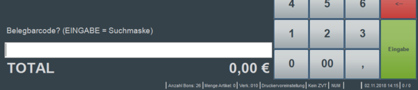 Ein geparkter Beleg kann zu einem späteren Zeitpunkt (je nach Rückstellungsdauer auch noch an Folgetagen) über die Funktion "Bon reaktivieren (F12)" zur Weiterbearbeitung aufgerufen werden. Hierzu wird der Belegbarcode des Parkbelegs mittels Scanner direkt in der Positionserfassung erfasst.