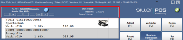 Bonusf. Umsatz: Je nach Einstellung des Bonussystems wird hier entweder der tagesgenaue bonusfähige Umsatz des Kunden angezeigt. Im bonusfähigen Umsatz sind die Artikel berücksichtigt, die der Bonusdefinition entsprechen. Alternativ erfolgt hier bei aktiviertem DirektBonus-System der Siller POS die Anzeige des live errechneten bonusfähigen Umsatzes. Die im aktuellen Kassenbeleg erfassten Artikel sind in der Berechnung ebenfalls bereits berücksichtigt.