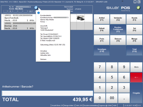 vollständige Adresse, Tel. privat, Tel. geschäftlich, E-Mail, zugeordnete Bonusgruppe, Geburtstag (Alter) des Kunden, hinterlegte Notiz zum Kunden, Umsatzsumme letztes Kalenderjahr und aktuelles Kalenderjahr.