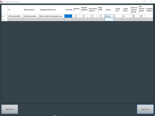 einfache Validierung auf Basis der Spalten "Länge (min.)", "Länge (max.)", "Nicht num. Zeichen erlaubt?", "Num. Zeichen erlaubt?".