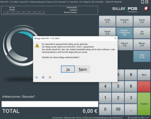 Im Falle eines Powerfailures (= Stromausfalles) oder einer anderen technischen Beeinträchtigung, welche zu einem unvorhergesehenen Absturz / Beenden der Kassensoftware führt, kann nach erneutem Start von Siller POS der zuletzt in Arbeit befindliche, aber noch nicht abgeschlossene Beleg automatisch wiederhergestellt werden.