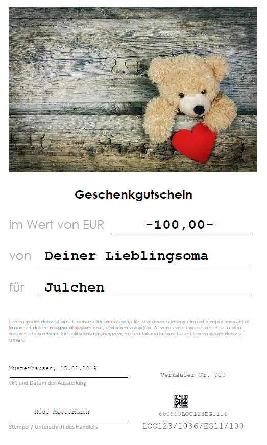 Die Kasse ermöglicht es, unterschiedliche und individuell gestaltete Gutscheinlayouts zu drucken. Auch Gutscheinvordrucke sind möglich.