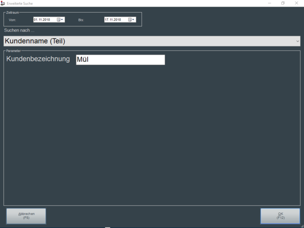 Die Auswahl des Filterkriteriums erfolgt komfortabel in der Maske. In dem nachfolgenden Beispiel sollen alle Verkaufsbelege angezeigt werden, die im Zeitraum 01.11.2018 bis 17.11.2018 auf Kundenname (Teil) = Mül erfasst wurden. Es werden also beispielsweise Journaleinträge angezeigt, die auf den Kunden "Müller" erfasst wurden.