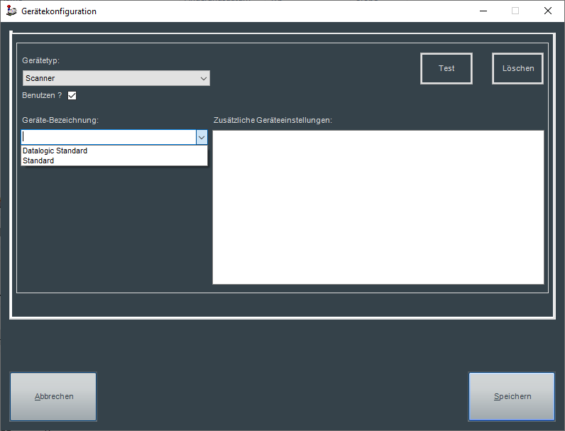 Wurde im Barcodescanner die Barcode-Erkennung aktiviert, muss diese auf Kassenseite ebenfalls in Verbindung mit der zugehörigen Geräte-Bezeichnung aktiviert werden. Über den Button "Test" lässt sich die korrekte Funktion des Barcodescanners prüfen.