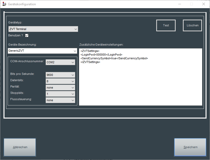 Hier sollte der Gerätetyp ausgewählt werden, welcher an die Kasse angeschlossen wird. Ist der spezifische Gerätetyp nicht aufgeführt, sollte GenericZVT ausgewählt werden (Standard: GenericZVT).