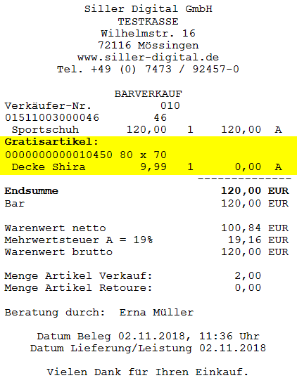 Die Position wird zusätzlich als Gratisartikel markiert (auch für nachgelagerte Systeme) und entsprechend auf dem Beleg mit Preisgegenüberstellung ausgewiesen.