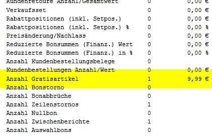 Im Rahmen des Zwischenberichtes sowie auch der Kassiererabrechnung erfolgt eine Protokollierung der Funktion Gratisartikel.