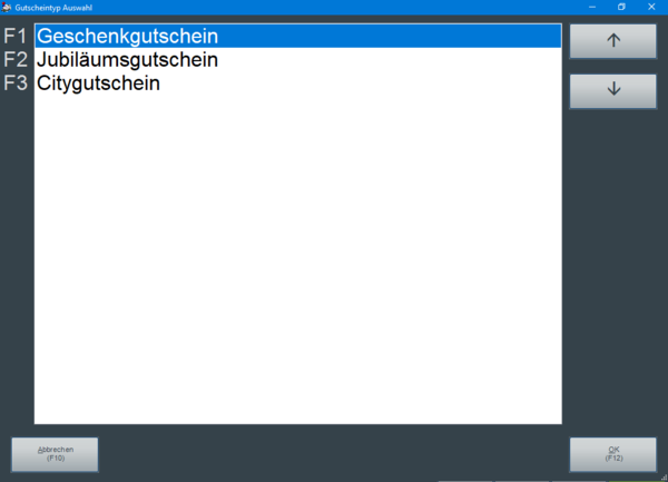 Die möglichen Gutscheintypen werden in der Maske Gutscheintyp Auswahl angezeigt. Der gewünschte Gutscheintyp wird nun in dieser Maske ausgewählt und anschließend mit "OK (F12)" bestätigt.