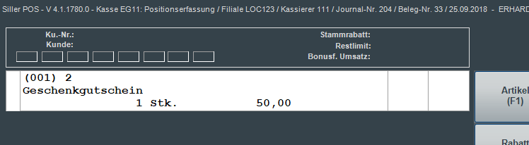 Der Gutschein wird nun in die Positionserfassung übernommen. Es können im Beleg weitere Positionen erfasst werden.