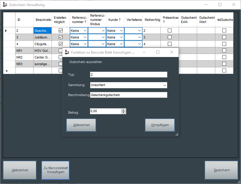 Über die Option "Zu Barcodeblatt hinzufügen" kann der Gutscheintyp als Barcode angelegt werden. Wird der Gutscheintyp häufiger verwendet, ist dies eine sinnvolle Funktion. Siehe dazu auch Scan-Funktionen.