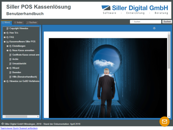 Über das Handbuch-Symbol ist die Online-Hilfe der Kassensoftware Siller POS abrufbar. Zudem werden hier notwendige Informationen zu den Themen GoBD, GDPdU, Verfahrensdokumentation sowie Tipps und How-To's angeboten, in vielen Fällen mit Beispielen, Bildern oder Erklärvideos.
