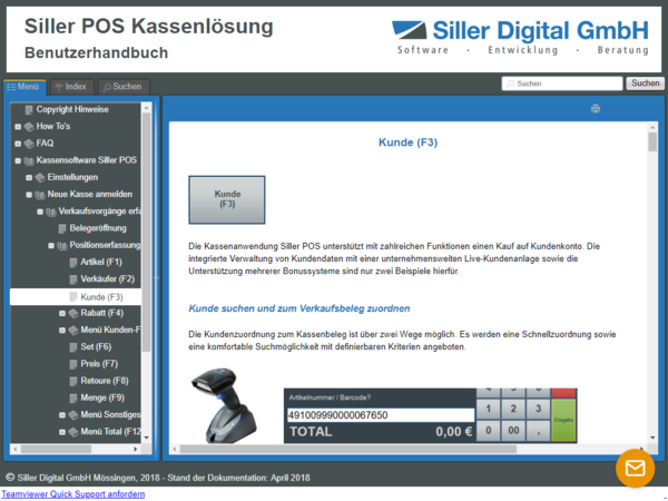 Alternativ steht jederzeit die Kontaktaufnahme über E-Mail oder via Telefonunterstützung zur Verfügung. Die Kontaktdaten finden Sie unter "Siller POS Benutzerhandbuch Release 4".