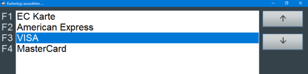 Anschließend wird durch den Anwender die erfolgreiche Kartenzahlung über die Funktion "Karte (F8)" durchgeführt. Über die Einstellungen der Kassensoftware können optional die akzeptierten Zahlungsmittel (Kartentypen) vordefiniert werden. Diese werden nach Aufruf der Funktion "Karte (F8)" zur Auswahl des in diesem Verkaufsvorgang akzeptierten Kartentyps angeboten.