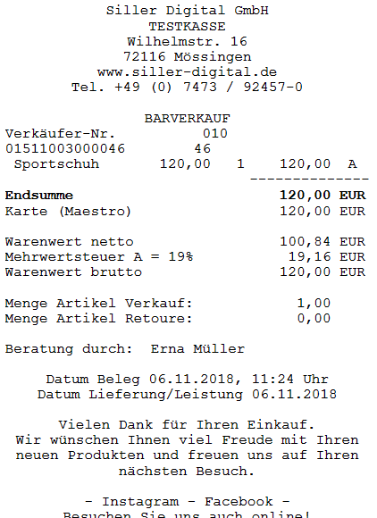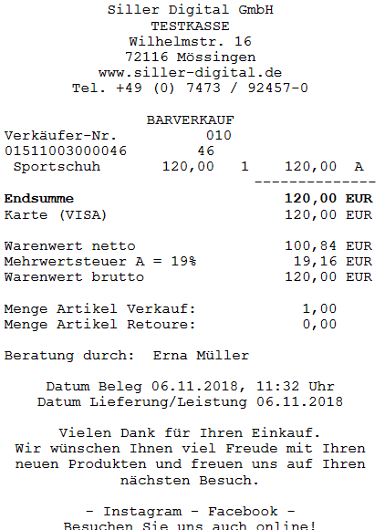 Nach Abschluss des Vorgangs am Zahlungsterminal erfolgt eine Rückmeldung der Zahlungsinformationen an die Kassensoftware Siller POS. War die Zahlung erfolgreich, bekommt die Kassenanwendung eine positive Meldung und das verwendete Zahlungsmittel zurückgeliefert. Siller POS akzeptiert dieses Zahlungsmittel und zeigt den Vorgang entsprechend in der Finanzierungsmaske an.