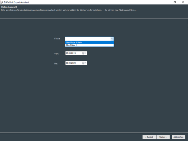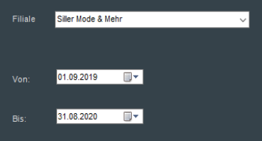 Die konkrete Filiale sowie der gewünschte Exportzeitraum werden in der nachfolgenden Maske abgefragt.