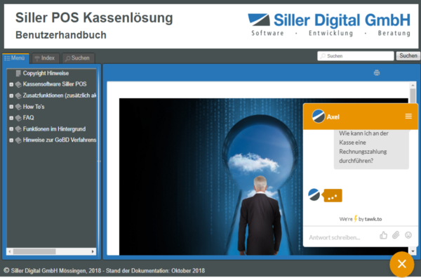 Die Support-Mitarbeiter stehen während der gültigen Supportzeiten (siehe www.siller-digital.de) für Chats zur Verfügung. Stehen keine Support-Mitarbeiter zur Verfügung (außerhalb der gültigen Supportzeiten oder sofern alle Support-Mitarbeiter sich in der Bearbeitung eines Supportfalles befinden, besteht über diesen Weg die Möglichkeit der schriftlichen Kontaktaufnahme.