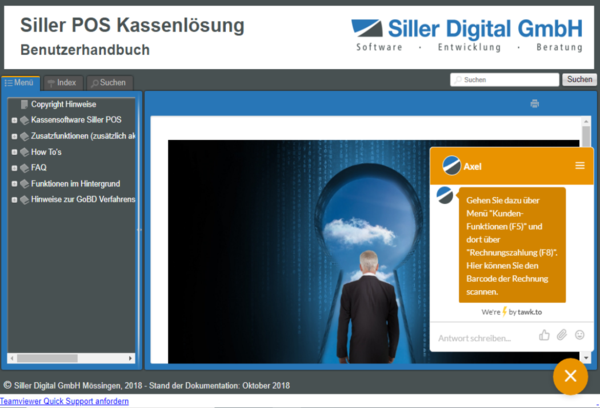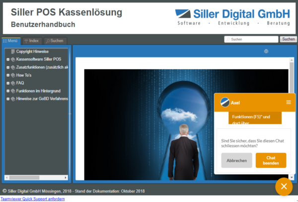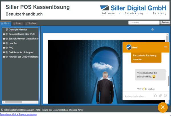 Alternativ steht jederzeit die Kontaktaufnahme über E-Mail oder via Telefonunterstützung zur Verfügung. Die Kontaktdaten finden Sie unter "Siller POS Benutzerhandbuch Release 4".