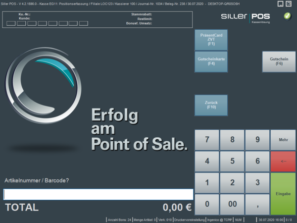Während der Positionserfassung kann über die Funktion "Sonstiges (F10)" – "Gutschein (F6)" ein Gutscheinverkauf durchgeführt werden. Dies können je nach Grundeinstellungen der Kassenanwendung entweder Verkäufe auf elektronische Gutscheinkarten (PräsentCard), Verkäufe von Gutscheinen in Papierform, Verkäufe von Gutscheinen über epay-Profil oder eine Mischung aus allen Varianten sein.