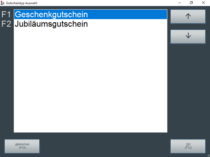 Die möglichen Gutscheintypen werden in der Maske Gutscheintyp Auswahl angezeigt. Der gewünschte Gutscheintyp wird nun in dieser Maske ausgewählt und anschließend mit "OK (F12)" bestätigt.