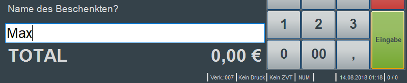 Da die Gutscheine vermutlich nicht an eine Person als Beschenktem überreicht werden, ist es sinnvoll, die Information Name des Beschenkten in diesem Fall nicht über die Kassenanwendung auszufüllen.
