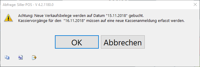 Wird die Anmeldung auf einen nicht dem Tagesdatum (Systemdatum) entsprechenden Umsatztag vorgenommen, erfolgt eine Hinweismeldung. Nach Bestätigung dieser Meldung mit "OK" erfolgt die Anmeldung auf den gewählten Umsatztag. Mit dem Button "Abbrechen" wird der Anmeldevorgang abgebrochen.