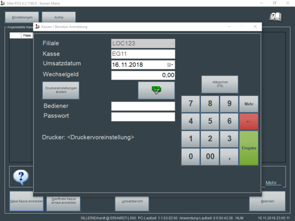 Zur Anmeldung eines Kassierers und damit zur Eröffnung einer neuen Kasse sind folgende Angaben notwendig: