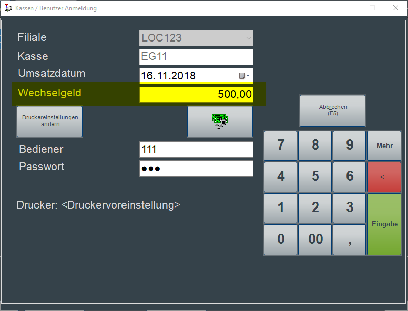 Der Wechselgeldanfang in Grundwährung kann direkt in der Kassen / Benutzer Anmeldung als Summe hinterlegt werden.