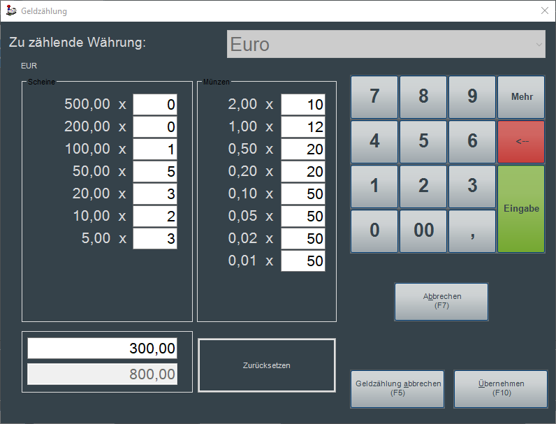 Alternativ ist über den Button "Geldzählung" die Erfassung des Wechselgeldanfangs (Grundwährung) in einer Stückelungsmaske möglich. Die Summe wird automatisch aus den einzelnen Stückelungswerten sowie der zusätzlich eingegebenen nicht gestückelten Summe gebildet.