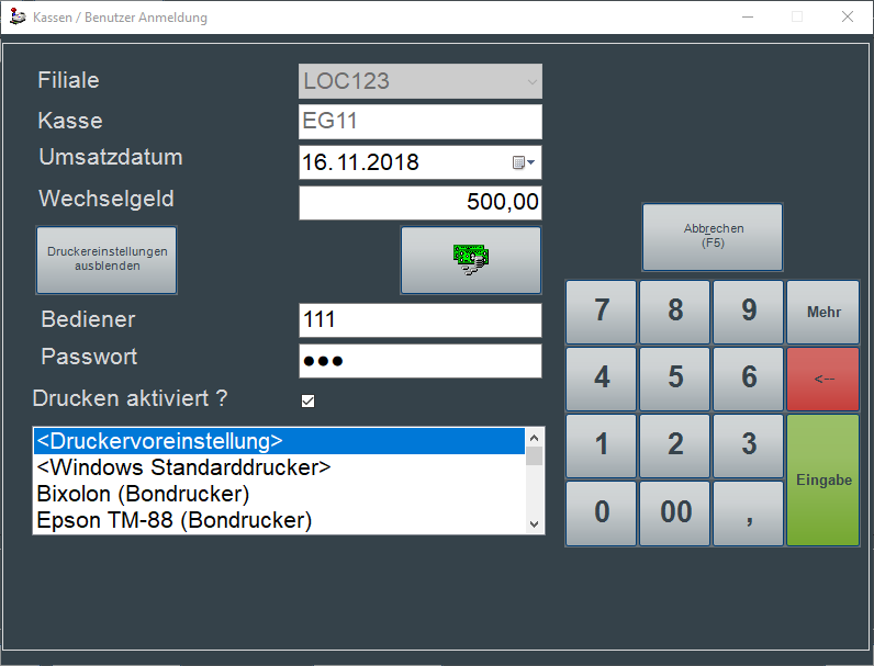 Sofern für die nachfolgend geöffnete Kasse nicht automatisch die Druckervoreinstellungen angewendet werden sollen, sondern ein spezifischer Drucker für alle erzeugten Belege gewählt werden soll (beispielsweise weil ein normalerweise für bestimmte Belegarten hinterlegter Laserdrucker momentan defekt ist und daher alle Belege auf Thermobeleg über den Bondrucker gedruckt werden sollen), dann kann dies über den Button "Druckereinstellungen ändern" bei Anmeldung der Kasse definiert werden. Eine geänderte Einstellung wird für diese Anmeldung gespeichert und gilt für diese Kasse. Nach erfolgter Abrechnung gelten wieder die automatischen Druckervoreinstellungen.
