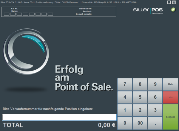 Erfassung der Kassierernummer, auf die nachfolgende Verkaufsbelege erfasst werden. Die hier erfasste Nummer muss mindestens über die Berechtigung Kassierer oder Kassierer / Verkäufer verfügen.