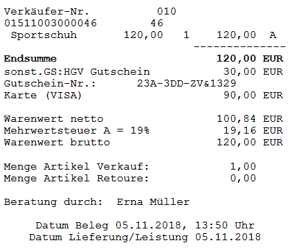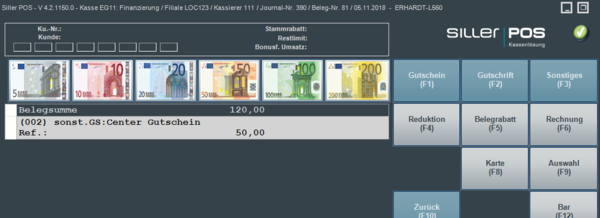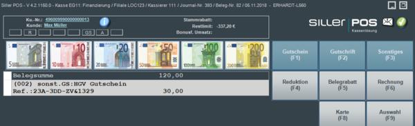 Eine externe Referenznummer kann im Vorgang auch per Barcodescanner erfasst werden, sofern auf dem externen Geschenkgutschein ein entsprechender Barcode vorhanden ist. Die Referenznummer wird im Beleg festgehalten und auch auf dem Verkaufsbeleg gedruckt. Damit ist eine spätere Auswertung der eingelösten externen Geschenkgutscheine möglich.